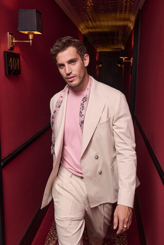 A pastel beige gives this loose-fitting suit made from wool, cotton and silk a special summer flair. The entire look is fluid, thanks to a minimalist interior and the elegant fabric. The jacket’s patch pockets exude casual charm, while the deep-notch lapels give it a more open feel while emphasising its relaxed style. Loose-cut piped trousers extend the silhouette. A simple, long-sleeved, crew-neck pullover in a warm pink makes the perfect top. And the patterned silk scarf from the same colour palette adds a decorative finishing touch.